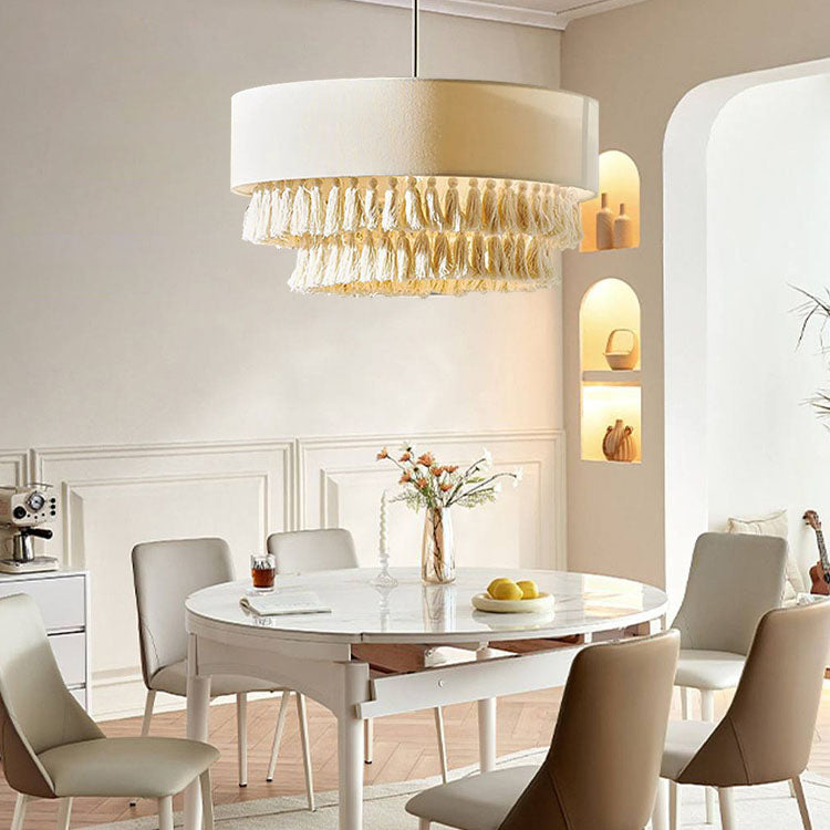 Contemporary Boho Fabric Cylinder Shade Tassel Braided Rope 3-Light Chandelier For Living Room